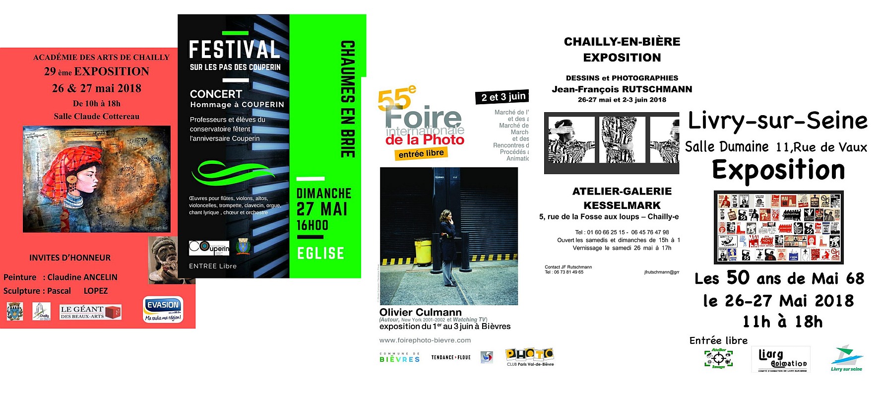 Expositions de Printemps Accueil » Actualités » Actualités » Expositions de Printemps 523652375238523952405262 C’est le printemps et les photographes renaissent avec le retour du soleil. C’est l’été et ils s’épanouissent profitant des beaux jours. L’Atelier Image de Livry avec Roger, Annie, … évoque mai 68 en affiches d’époque Jean-François est à Chailly-en-Bière et présente dessins et photos Marianne, musicienne, est en concert à Chaumes-En-brie Michel est à Chailly-en-Bière avec l’académie des arts de la ville. Marianne expose aussi ses « Chemins de vie » à la foire de Bièvres x Laisser une réponse Cancel replyYour email address will not be published. Required fields are marked *Nom* Email* Site web Save my name, email, and website in this browser for the next time I comment. CAPTCHA * Saisissez le texte affiché ci-dessus: Δ Ce site utilise Akismet pour réduire les indésirables. En savoir plus sur la façon dont les données de vos commentaires sont traitées.